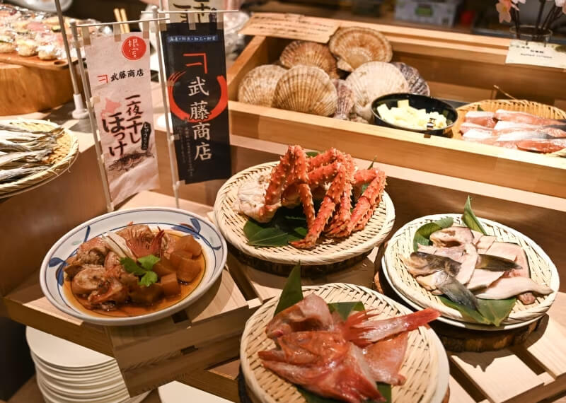 漁港直送!炉端焼きやお刺身、職人が目の前で握るお寿司、 旬食材の揚げたて天ぷら、地元富良野の提携農家より仕入れた野菜サラダなど 和洋中合わせて約50品以上をビュッフェスタイルでご用意♪
